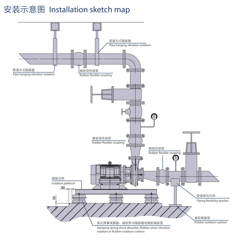 7.可根據(jù)要求采用不同材質(zhì)。 GPS臥式直接離心泵安裝示意圖: